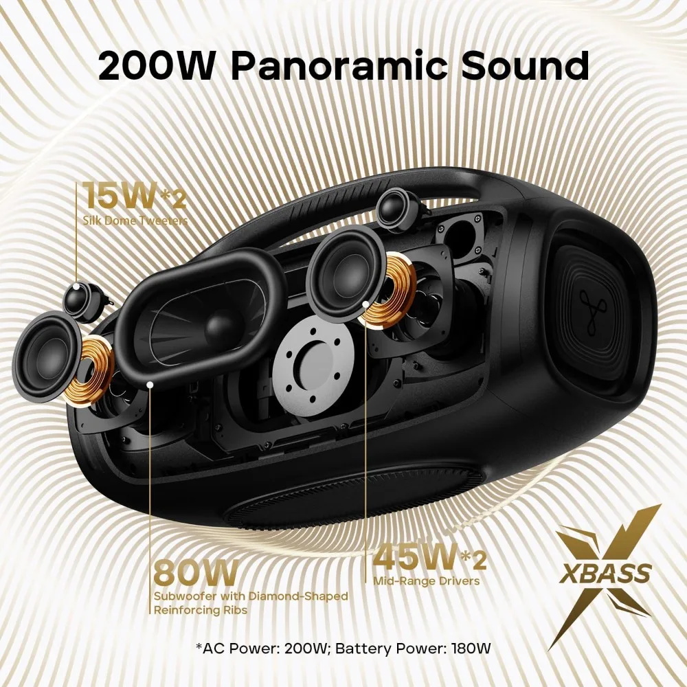 • Explosive 200W Output: Featuring an 80W subwoofer with diamond reinforcement ribs, dual 45W mid-range drivers, and two 15W tweeters, this speaker for party delivers precise beats and notes. Its 2.1 channel design, powered by two advanced TI amplifiers, ensures balanced and dynamic sound, while dual large passive radiators enhance the bass for deeper resonance.